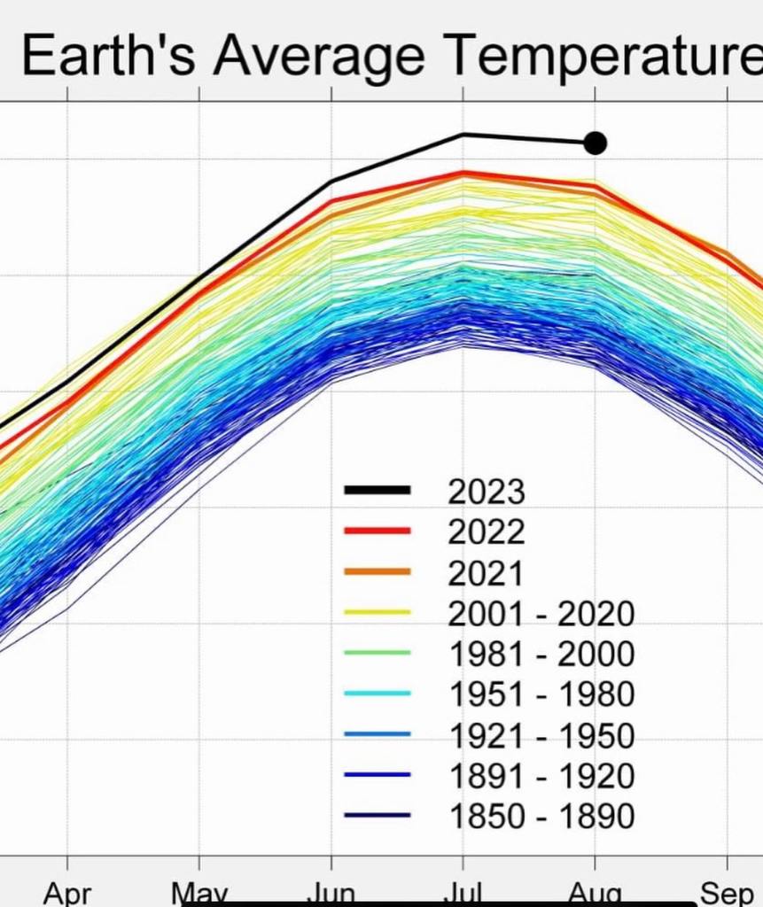 Figure 3 shows part of a plot of global average temperature. There has been a steady increase over a century or so – yes, that is global warming. 2021 and 2022 were on the high side, but still on the edge of previous years’ plots. 2023 has taken off into the wild blue yonder.
