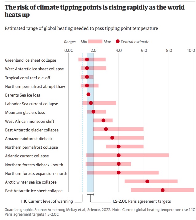 You will notice there is a pink band of uncertainty around each red dot. Perhaps those systems won’t tip until 2-3°C of warming. Or perhaps they are already tipping.